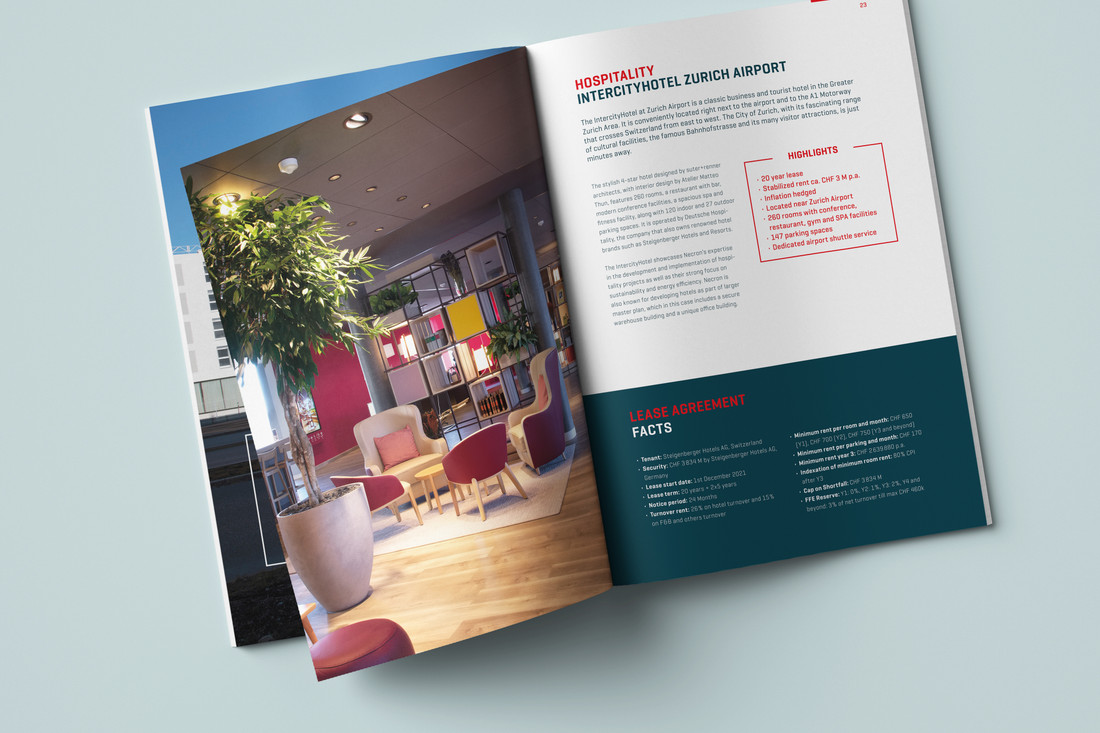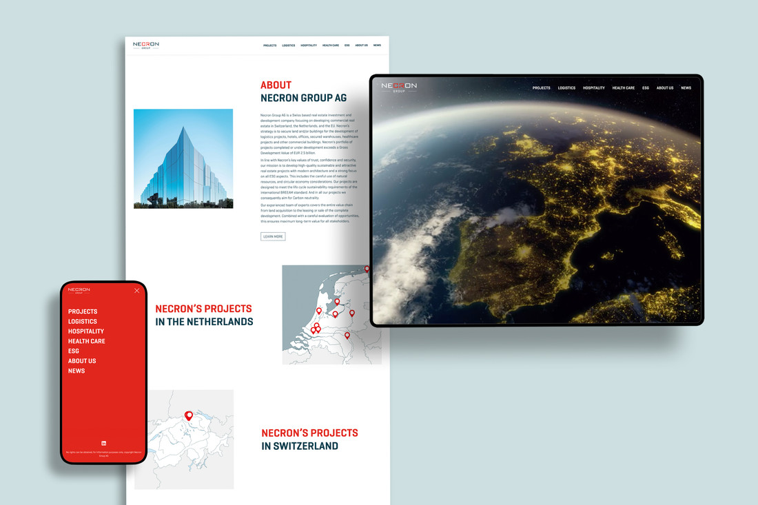 Necron Group AG ist eine Schweizer Immobilien-Investment und Entwicklungsgesellschaft. Ihr Schwerpunkt liegt auf der Entwicklung und Umsetzung von gewerblichen Immobilienprojekten (Hotels, Health Care, Logistik) in der Schweiz und der EU – mit Fokus auf die Niederlande. Wir begleiten Necron vollumfänglich, angefangen bei Investorenbonds über Kommunikationsmittel für die Vermarktung der Projekte bis hin zu Public Relations, Webauftritt und Bewegtbild.